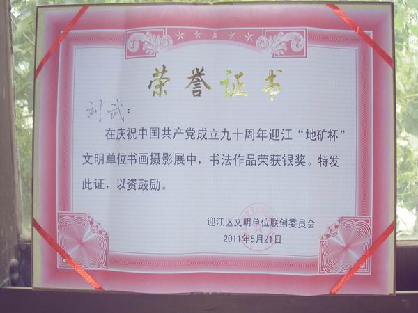 為慶祝中國共產(chǎn)黨成立九十周年,在安慶市迎江“地礦杯”文明單位書畫攝影展中,樅陽公司劉武同志書法作品,圓潤而溫文,粗曠而豪放,氣勢非凡,給人以美感,受到觀賞者廣泛稱贊,榮獲銀獎,展示了鹽業(yè)企業(yè)豐厚的文化底蘊。