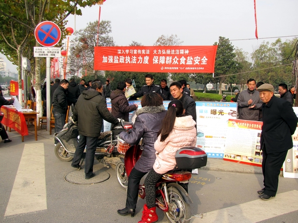 阜陽市鹽務局高度重視此次宣傳活動,結(jié)合自身業(yè)務范疇,精心準備大量法制宣傳資料。早晨7時,天氣陰冷,寒風勁吹,我局鹽政執(zhí)法人員在副局長王道亞的帶領下,早早地布置好法制宣傳臺。在活動現(xiàn)場王道亞親自向過往群眾宣傳鹽政法律法規(guī)知識,宣傳消費者、經(jīng)營者的權利和義務,宣傳消費者如何依法維權;進行了假冒偽劣食鹽展示和鑒別;開展了涉鹽咨詢、受理投訴舉報。此次宣傳共發(fā)放宣傳資料500余份,接受群眾咨詢200余人次?;顒蝇F(xiàn)場布置了咨詢展臺,擺放宣傳圖板10塊、宣傳展架3個、懸掛 2條生動主題橫幅,展示了近期查獲的部分劣質(zhì)私鹽樣品,教市民辨別真假碘鹽的活動,咨詢臺前觀看宣傳圖版和前來咨詢的群眾絡繹不絕,受到了親自趕赴現(xiàn)場慰問的市人大常委副主任李新才、市政府副市長黃珍、市政協(xié)副主席張永俠、市委宣傳部、市司法局和市依法治市領導小組辦公室有關領導以及廣大群眾的一致好評。