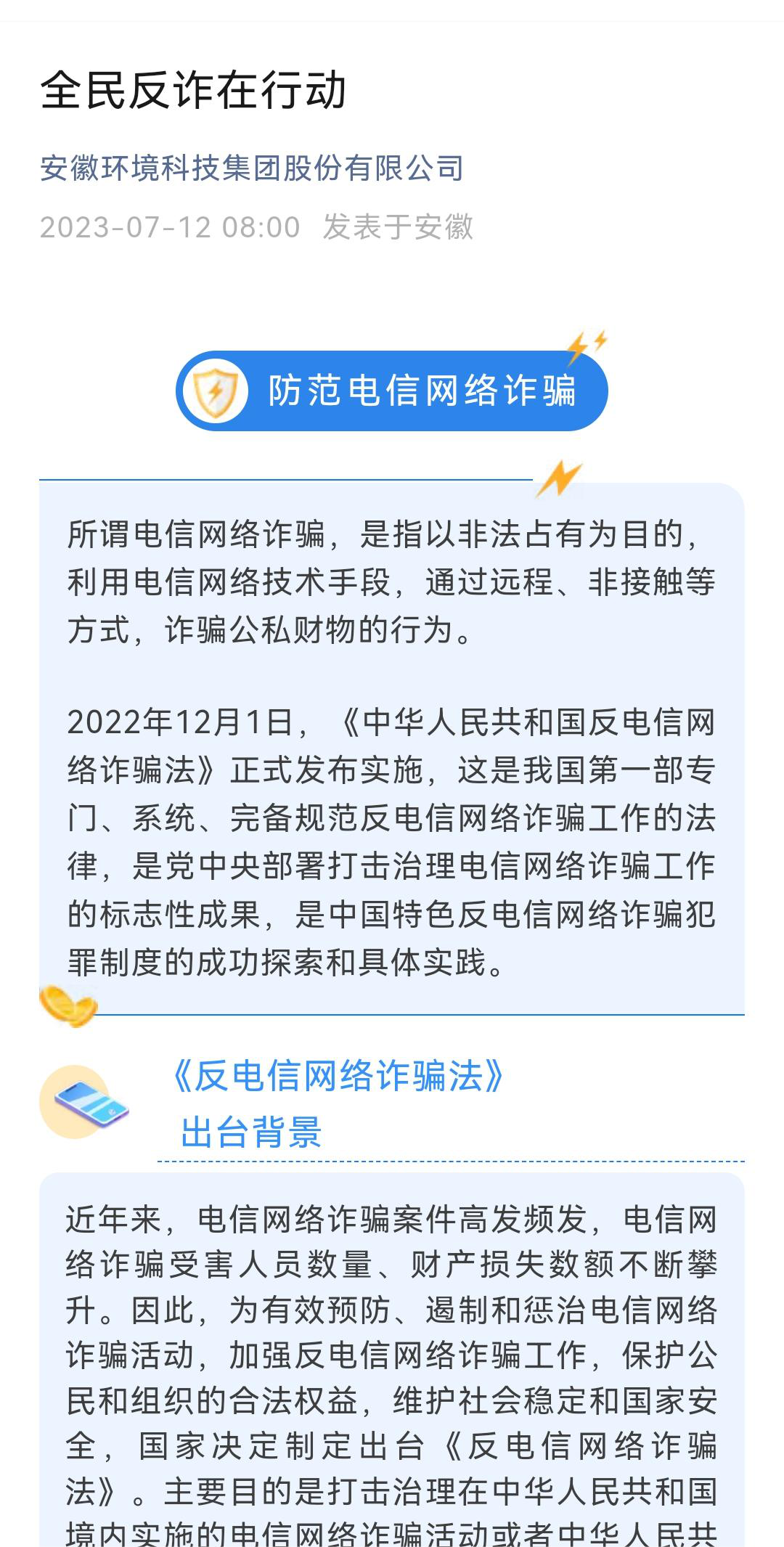 環(huán)境科技集團、省健康養(yǎng)老、徽鹽金融等公司通過印制各類反詐宣傳單、宣講防范電信詐騙安全知識,在公眾號發(fā)表普法文章等形式,號召全體員工增強防范意識。