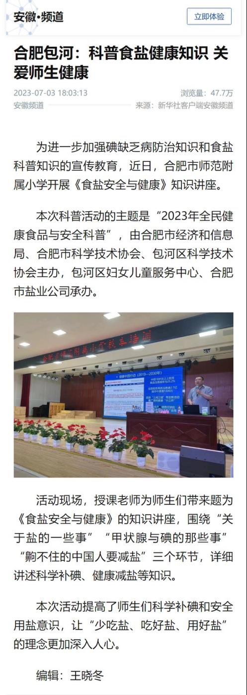 為切實(shí)做好黨的二十大精神宣傳貫徹工作,在習(xí)近平新時(shí)代中國(guó)特色社會(huì)主義思想指引下 ,進(jìn)一步樹(shù)牢以人民健康為中心的發(fā)展思想,合肥鹽業(yè)在合肥市師范附屬小學(xué)開(kāi)展食鹽科普活動(dòng),為全校200余名師生普及科學(xué)補(bǔ)碘、健康減鹽知識(shí),關(guān)愛(ài)師生健康,推廣中鹽低鈉鹽,助力健康中國(guó)建設(shè),食鹽健康科普活動(dòng)得到新華社客戶(hù)端安徽頻道關(guān)注報(bào)道,截至發(fā)稿日總瀏覽量達(dá)47.7萬(wàn)次。